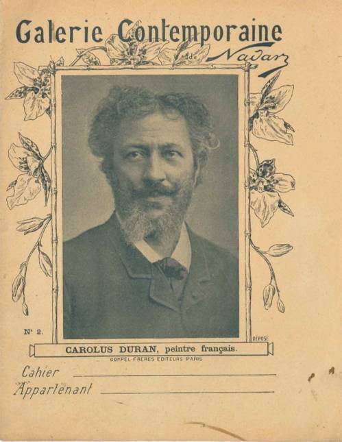 Couverture n° 2 : Carolus Duran, peintre. Chromolithographie sur papier épais. Cliché en n/b de Nadar et frise florale. Au dos, texte anonyme explicatif.