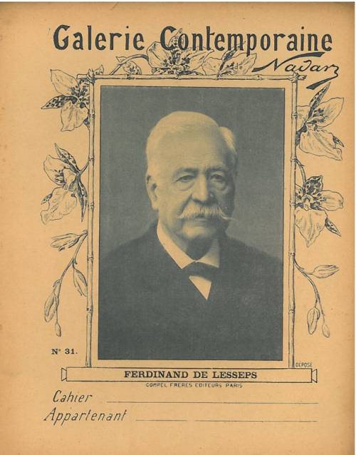 Couverture n°31 : De Lesseps, diplomate et entrepreneur, architecte. Chromolithographie sur papier épais. Cliché en n/b de Nadar et frise florale. Dos arraché.