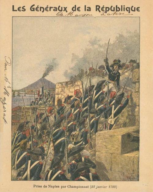 Couverture non numérotée : Prise de Naples par Championnet (23 janvier 1799). Chromolithographie sur papier épais beige. Au dos, texte explicatif signé E r. Richa, anagramme de l’éditeur.