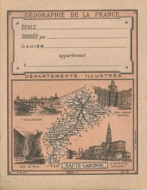 Couverture n°30 : Haute-Garonne. Chromolithographie sur papier épais beige. Carte départementale et gravures sur plusieurs sites ou monuments. Au dos, présentation du département.