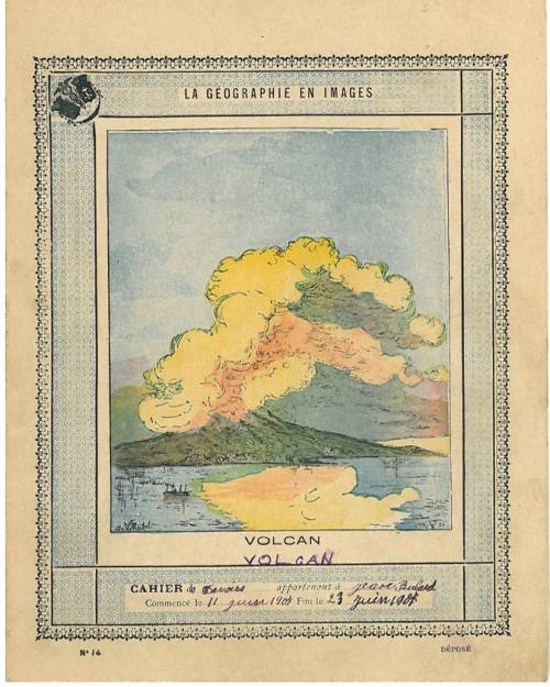 Couverture n°14 : Volcan. Chromolithographie sur papier beige épais avec frise bleue et noire… cahier appartenant à Jean Bolard, commencé le 11 juin 1907, fini le 23 juin 1907. Au dos, texte explicatif signé Emile Hanzen-Blangsted