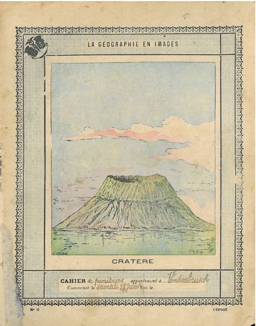 Couverture n°11 : Le cratère. Chromolithographie sur papier beige épais avec frise bleue et noire... cahier de punition appartenant à Vandenbeusch. Au dos, texte explicatif signé Emile Hanzen-Blangsted