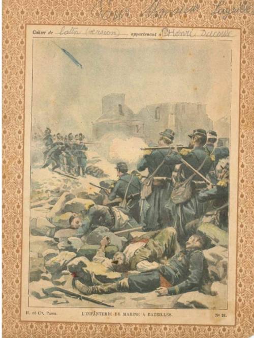 Couverture n° 21 : L’infanterie de marine à Bazeilles. Chromolithographie sur rose épais. Fond ornementé marron. Au dos, texte extrait de La défense de Bazeilles, de G. Bastard.