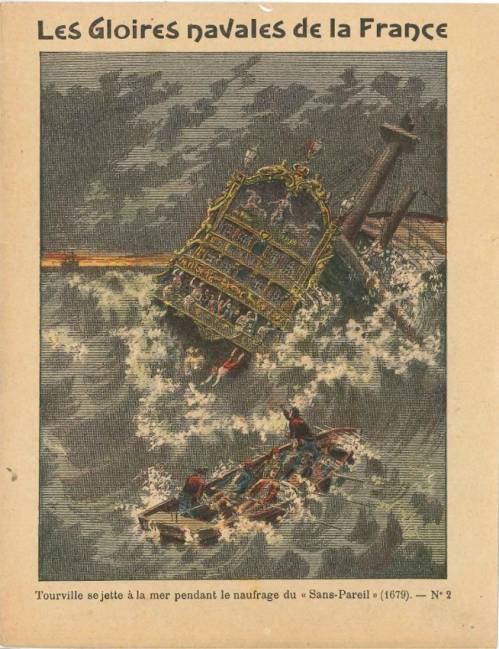 Couverture n°1 : Tourville se jette dans la mer pendant le naufrage du Sans-Pareil (1679). Chromolithographie sur papier épais beige. Au dos, texte explicatif signé Er. Richa, l’anagramme de l’éditeur
