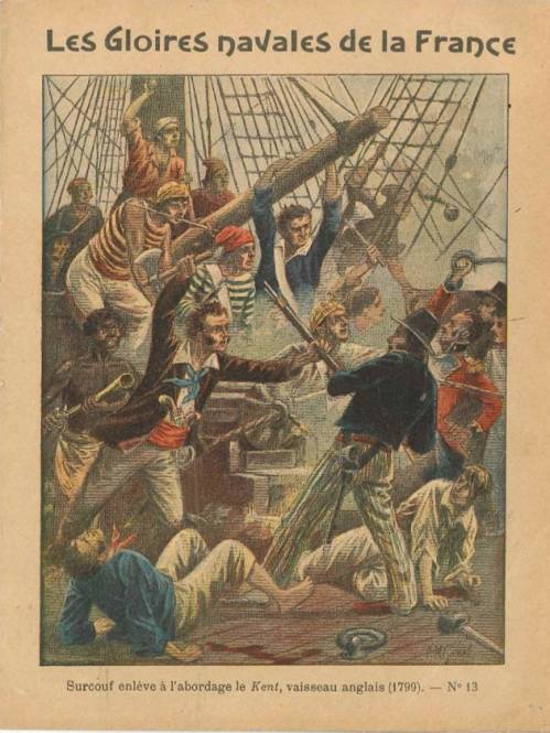 Couverture non numérotée : Surcouf prend à l’abordage le Kent, un navire anglais (1799). Chromolithographie sur papier épais beige. Au dos, texte explicatif signé Er. Richa, l’anagramme de l’éditeur. .