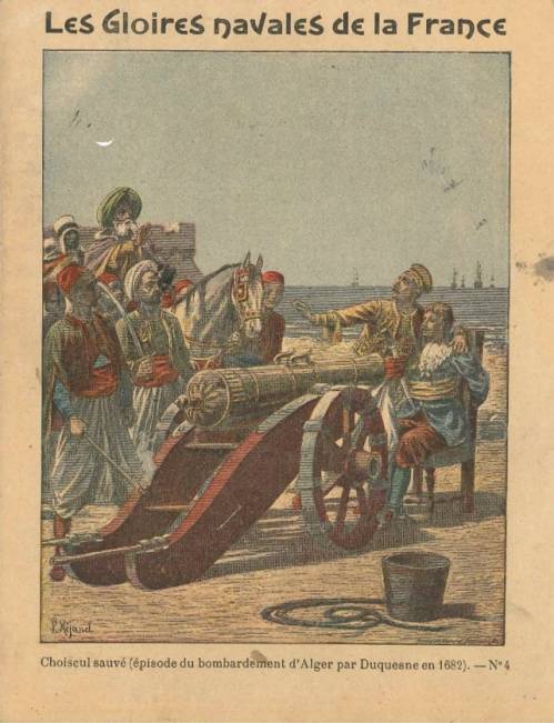 Couverture n°4 : Choiseul sauvé (épisode du bombardement d’Alger par Dus en 16682esne). Chromolithographie sur papier épais beige. Au dos, texte explicatif signé Er. Richa, l’anagramme de l’éditeur