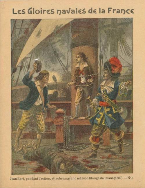 Couverture n°5 : Jean Bart, pendant l’action, tache au grand mât son fils âgé de 10 ans (1689). Chromolithographie sur papier épais beige. Au dos, texte explicatif signé Er. Richa, l’anagramme de l’éditeur.