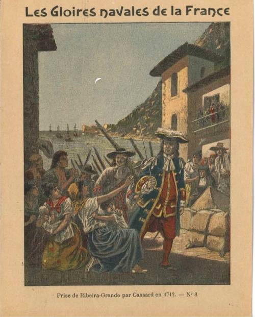 Couverture n°8 : Prise de Ribeira-Grande par Cassard (1712). Chromolithographie sur papier épais beige. Au dos, texte explicatif signé Er. Richa, l’anagramme de l’éditeur.
