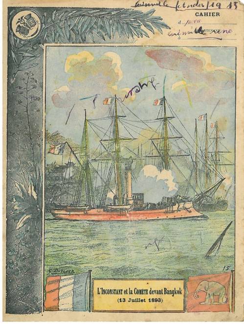 Couverture non numérotée : L’Inconstant et la Comète devant Bangkok (13 juillet 1893). Chromolithographie sur papier épais beige. Frise feuillue, blasons en bas. Au dos, texte explicatif anonyme avec frise élégante bleue.