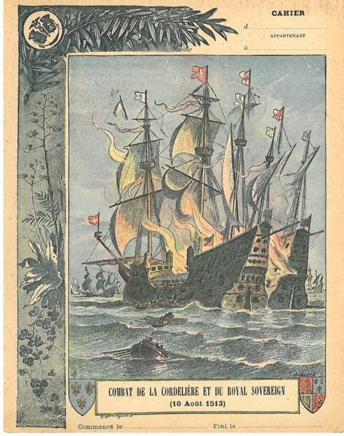 Couverture non numérotée : Combat de la Cordelière et du Royal Sovereign -10 août 1513). Chromolithographie sur papier épais beige. Frise feuillue, blasons en bas. Au dos, texte explicatif anonyme avec frise élégante bleue.