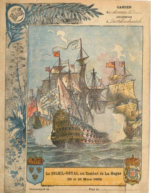 Couverture non numérotée : Le Soleil-Royal au combat de la Hogue (29 et 30 mars1692). Chromolithographie sur papier épais beige. Frise feuillue, blasons en bas… cahier de devoirs appartenant à Vandenbeusch. Au dos, texte explicatif anonyme avec frise élégante bleue.
