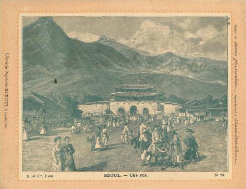 Couverture n° 23 : Séoul (Une rue). Chromolithographie sur papier épais ; Bichromie… cahier de devoirs journaliers appartenant à Marie Mouilleron. Au dos, texte anonyme explicatif, sur Séoul et Tokyo, et gravure (Une pagode).