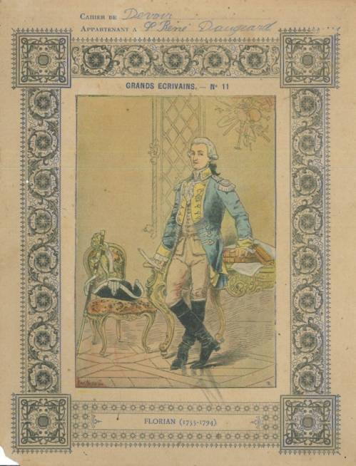 Couverture n°11: Florian. Cadre très ornementé (motifs floraux et volutes) en n&b sur les deux plats. Chromolithographie au plat supérieur / texte imprimé en noir au plat inférieur. Au dos, biographie signée Honoré Bonhomme.