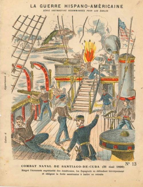 Couverture n°13 : Combat naval de Santiago-de-Cuba (31 mai 1898). Chromolithographie sur papier beige épais. Au dos, texte explicatif anonyme sur les origines de la guerre.