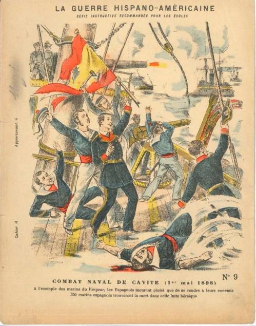 Couverture n°9 : Combat naval de Cavité (1er mai 1898). Chromolithographie sur papier beige épais. Au dos, texte explicatif anonyme sur les origines de la guerre.
