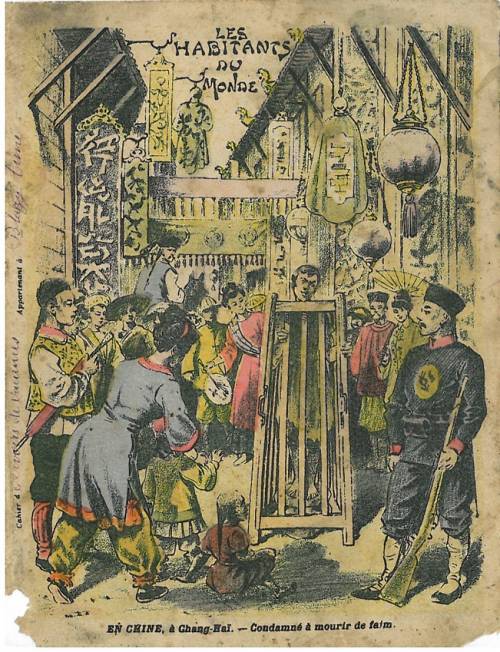 Couverture non numérotée : En Chine, à Chang-Haï, condamné à mourir de faim Chromolithographie sur papier épais beige… cahier de devoir de vacances appartenant à (illisible) Blazy. Au dos, texte explicatif anonyme