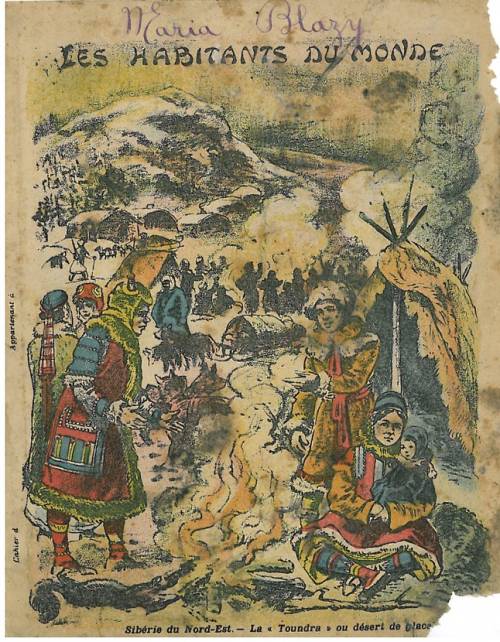 Couverture non numérotée : Sibérie du Nord-Est : la toundra ou désert blanc. Chromolithographie sur papier épais beige… cahier de classe appartenant à Maria Blazy. Au dos, texte explicatif anonyme