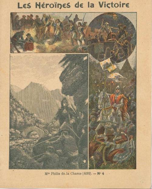 Couverture n°4 : Philis de la Charce. Chromolithographie sur papier épais beige. Frise historique annonçant les principales héroïnes évoquées dans la série. Au dos, texte explicatif signé des initiales O.N…