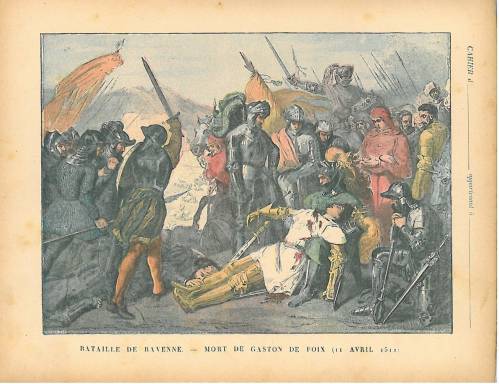 Couverture non numérotée : Bataille de Ravenne / Mort de Gaston de Foix (11 avril 1512). Chromolithographie sur papier épais beige. Au dos, texte explicatif signé A-L.