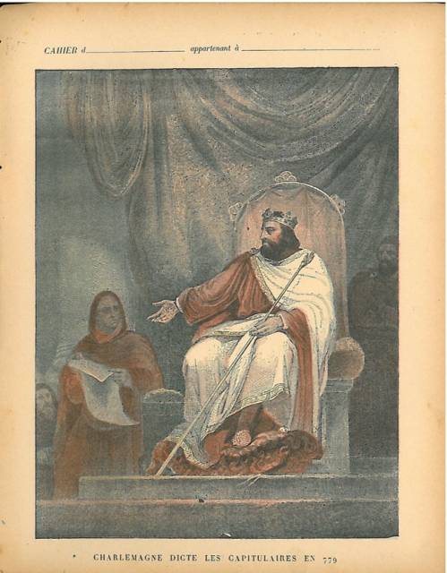 Couverture non numérotée : Charlemagne dicte les Capitulaires en 779. Chromolithographie sur papier épais beige. Au dos, texte explicatif signé A-L.