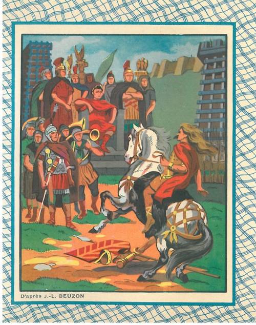 Cette série, non numérotée et incomplète dans la collection, est illustrée « d’après JL. Beuzon ». Sous cette signature, sans doute deux frères, Joseph et Louis, actifs dans les années 1910 1930… On leur connait des affiches colonialistes, notamment sur les expositions coloniales de Paris et de Marseille, et des illustrations historiques à la ligne épurée et aux couleurs vives, que l’écolier retrouvera dans ses manuels scolaires et sur ses couvertures de cahier.