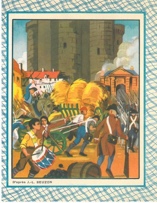 Cette série, non numérotée et incomplète dans la collection, est illustrée « d’après JL. Beuzon ». Sous cette signature, sans doute deux frères, Joseph et Louis, actifs dans les années 1910 1930… On leur connait des affiches colonialistes, notamment sur les expositions coloniales de Paris et de Marseille, et des illustrations historiques à la ligne épurée et aux couleurs vives, que l’écolier retrouvera dans ses manuels scolaires et sur ses couvertures de cahier.