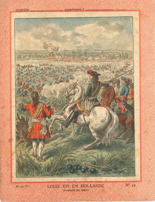 Couverture n°12 : Louis XIV en Hollande. Fond rose. Chromolithographie sur papier épais beige. . Au dos, texte explicatif anonyme.