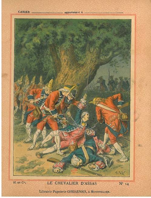 Couverture n°14 : Mort du chevalier d’Assas.. Fond rose. Chromolithographie sur papier épais beige. . Au dos, texte explicatif anonyme.