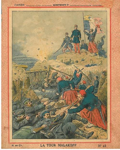 Couverture n°23 : La Tour Malakoff à Sébastopol. Fond rose. Chromolithographie sur papier épais beige. Au dos, texte explicatif anonyme.