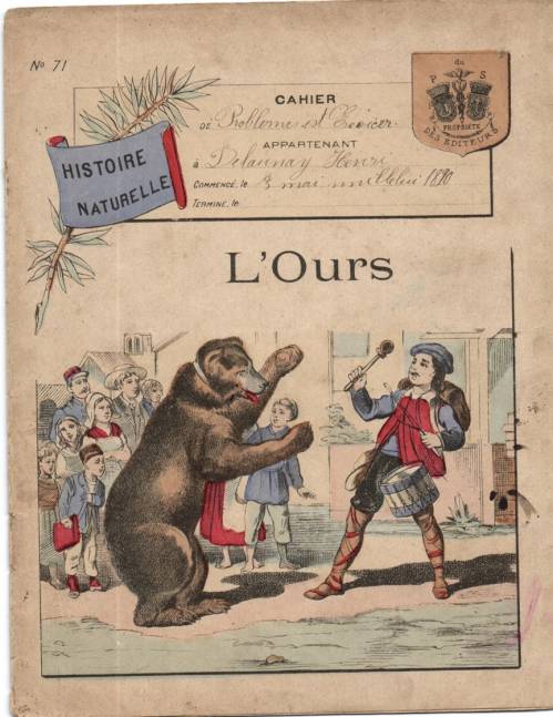 Couverture n°71 : L’ours. Chromolithographie sur papier épais beige Cartouche « Histoire naturelle » avec branche feuillue… cahier de problèmes appartenant à Hneri Delaunay. Au dos, texte explicatif anonyme.