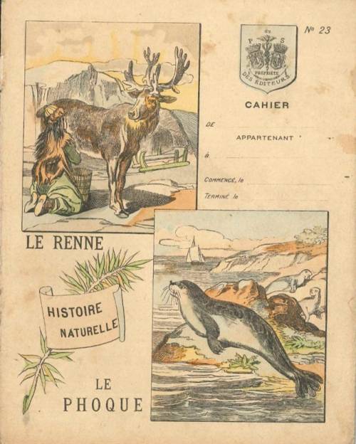 Couverture n°23 : Le renne t le phoque. Chromolithographie sur papier épais beige Cartouche « Histoire naturelle » avec branche feuillue. Au dos, texte explicatif anonyme.