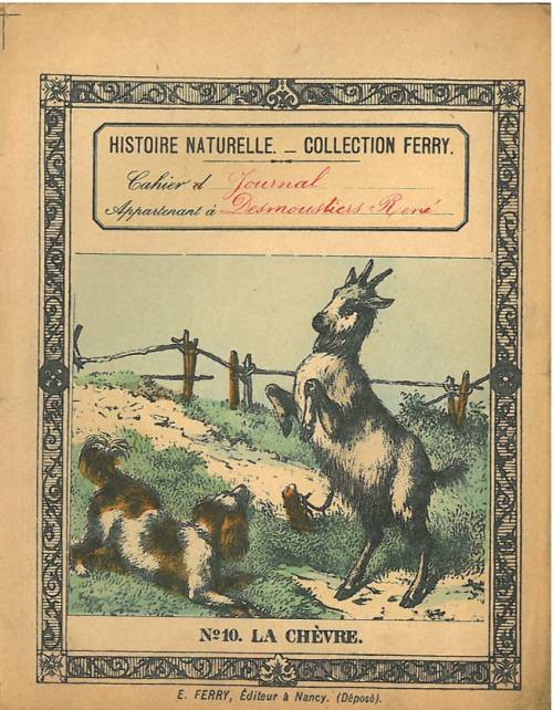 Couverture n° 10 : La chèvre. Chromolithographie sur papier épais beige. Frise noire… cahier-journal appartenant à René Desmoustiers. Au dos, texte extrait de l’Histoire naturelle, de Buffon.