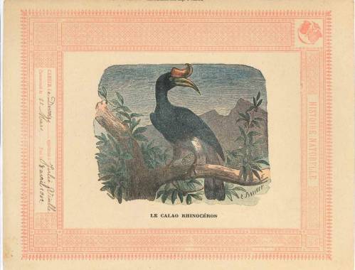 Couverture non numérotée : Le Calao. Chromolithographie sur papier épais beige. Frise rouge… cahier de devoirs appartenant à Julie Viallé. Au dos, texte explicatif anonyme.