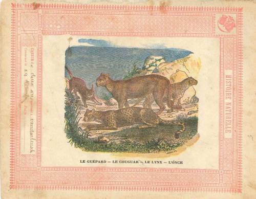 Couverture non numérotée : Guépard/ Cougar / lynx / Once. Chromolithographie sur papier épais beige. Frise rouge… cahier deux sous ( !), appartenant à Vandenbeusche. Au dos, texte explicatif anonyme.