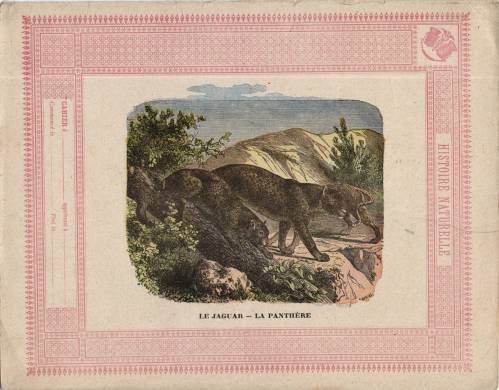 Couverture non numérotée : Le jaguar / La panthère. Chromolithographie sur papier épais beige. Frise rouge. Au dos, texte explicatif anonyme.