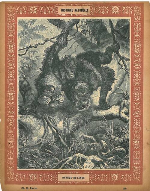 Couverture n° 26: Le orang-outan. Chromolithographie sur papier épais beige. Frise rouge-orangé. Au dos, texte explicatif anonyme.