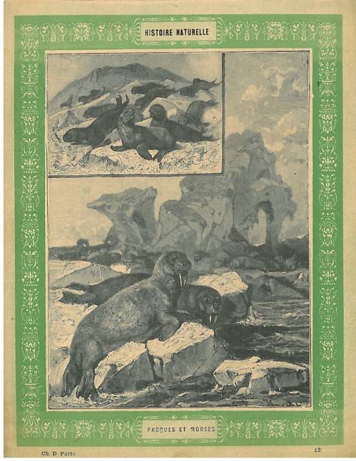 Couverture n°12 : Phoques et morses. Chromolithographie sur papier épais beige. Frise vert. Au dos, texte explicatif anonyme.