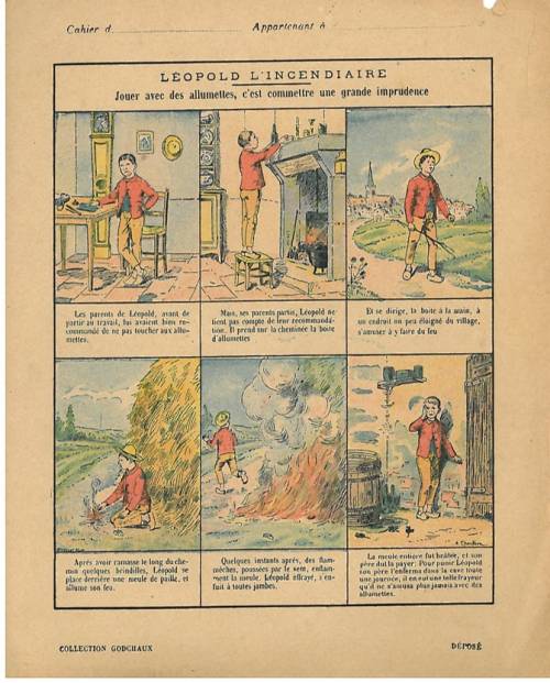 Couverture non numérotée : Léopold l’incendiaire / Jouer avec des allumettes, c’est commettre une grande imprudence. Chromolithographie sur papier épais beige. Plusieurs saynètes avec légende. Au dos, reprise des saynètes, « Page à colorier par l’élève ».