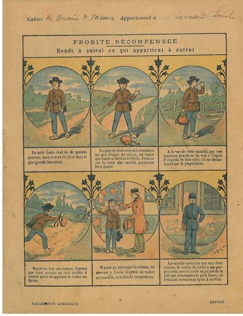 Couverture non numérotée : Probité récompensé / Rends à autrui ce qui appartient à autrui. Chromolithographie sur papier épais beige. Plusieurs saynètes avec légende…. Cahier de devoirs de vacances appartenant à Emile Berrar. Au dos, reprise des saynètes, « Page à colorier par l’élève ».