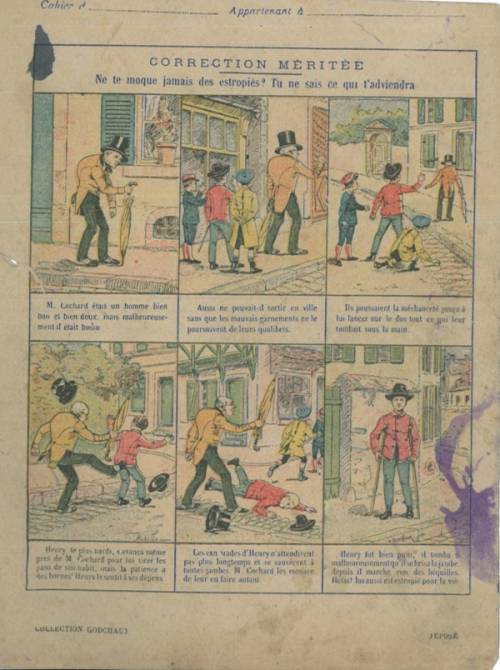 Couverture non numérotée : Correction méritée / Ne te moque jamais des estropiés, tu ne sais pas ce qui t’adviendra. Chromolithographie sur papier épais beige. Plusieurs saynètes avec légende. Au dos, reprise des saynètes, « Page à colorier par l’élève ».