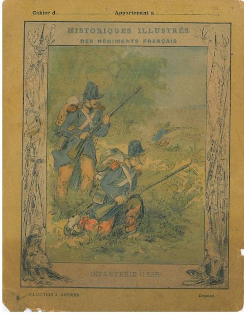 Couverture non numérotée : Infanterie 1835. Chromolithographie sur papier épais beige. Au dos, texte explicatif sur le 70ème régiment de ligne, signé Louis Chrétien.