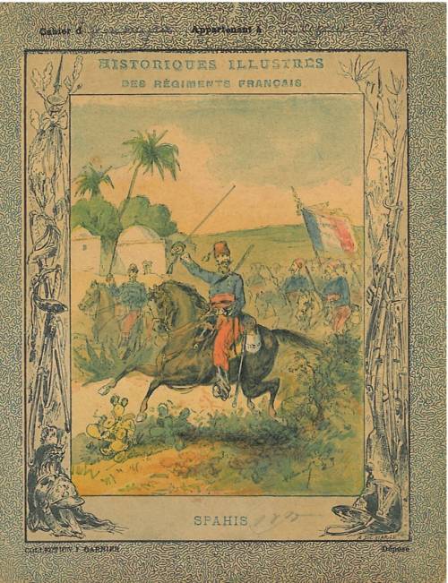 Couverture non numérotée : Spahis. Chromolithographie sur papier épais beige. Au dos, texte explicatif sue le 1er régiment de spahis, signé Louis Chrétien.