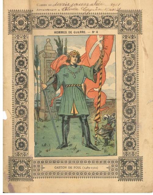 Couverture n° 4 Gaston de Foix. Chromolithographie sur papier épais beige. Frise florale grise… cahier de devoir journalier appartenant à Thérèse Copprin. Au dos, texte signé Edgar Zévort