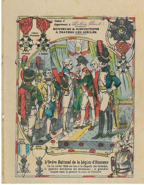 Le titre complet de cette série, numérotée et incomplète dans la collection, a comme titre complet Honneurs et distinctions à travers les siècles. C’est une production des papeteries vosgiennes de Clairefontaine. En 1858, Jean-Baptiste Bichelberger reprend un moulin à papiers ((à base de chiffon) créé au 16ème siècle et le modernise. Vingt ans plus tard, son fils et son gendre, Campion, y introduisent le bois comme matière première et se lancent dans la fabrication d’enveloppes et de cahier. De 1904 à 1914, l’entreprise (1000 employés) est dirigée par Louis Nusse et Étienne Bodet. Illustrateur inconnu.