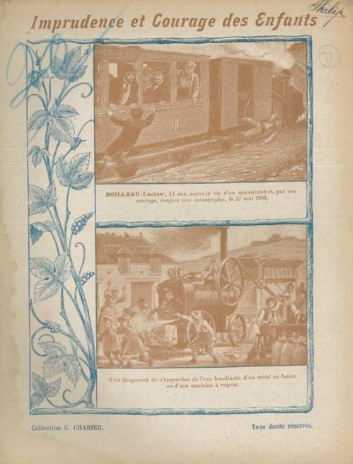 Cette série, non numérotée et incomplète dans la collection, présente en 1ère de couverture deux gravures : un acte d’héroïsme d’un enfant (et une mise en garde (« Il est dangereux de de marcher sur la glace d’une rivière, de toucher aux armes à feu et à la poudre, verser du pétrole dans une lampe, près d’une flamme, etc.… »). C’est une des très nombreuses productions de la maison d’édition saumuroise Charier.