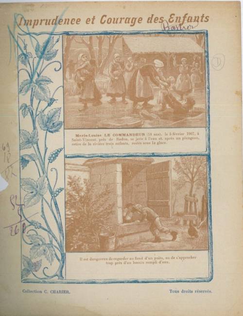 Cette série, non numérotée et incomplète dans la collection, présente en 1ère de couverture deux gravures : un acte d’héroïsme d’un enfant (et une mise en garde (« Il est dangereux de de marcher sur la glace d’une rivière, de toucher aux armes à feu et à la poudre, verser du pétrole dans une lampe, près d’une flamme, etc.… »). C’est une des très nombreuses productions de la maison d’édition saumuroise Charier.