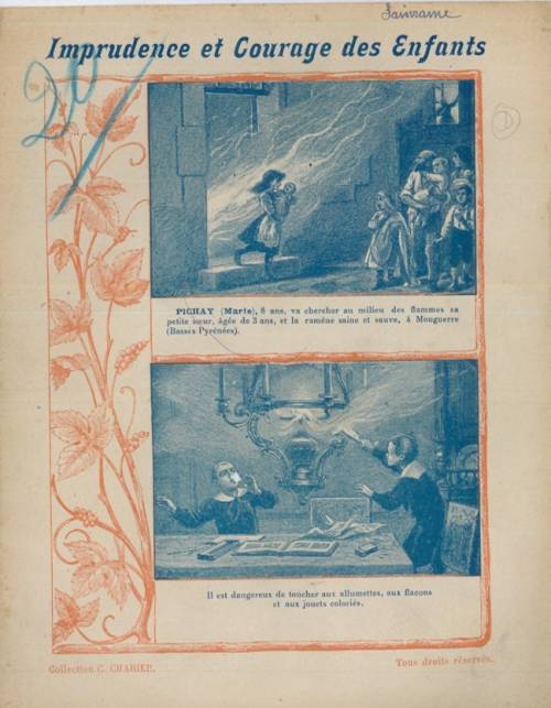 Cette série, non numérotée et incomplète dans la collection, présente en 1ère de couverture deux gravures : un acte d’héroïsme d’un enfant (et une mise en garde (« Il est dangereux de de marcher sur la glace d’une rivière, de toucher aux armes à feu et à la poudre, verser du pétrole dans une lampe, près d’une flamme, etc.… »). C’est une des très nombreuses productions de la maison d’édition saumuroise Charier.