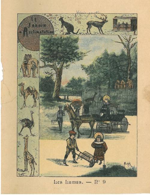 Couverture n°9 : Les lamas. Chromolithographie avec cadre en L renversé, gravé d'animaux. Papier beige épais. Au dos, texte explicatif avec frise ornementale rose, signée Er. Richa, l’anagramme de Charier