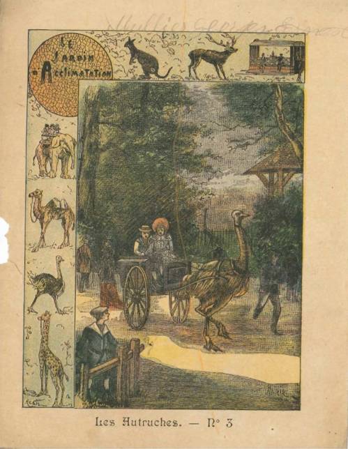 Couverture n° 3 : Les autruches. Chromolithographie avec cadre en L renversé, gravé d'animaux. Papier beige épais. Au dos, texte explicatif avec frise ornementale rose, signée Er. Richa, l’anagramme de Charier