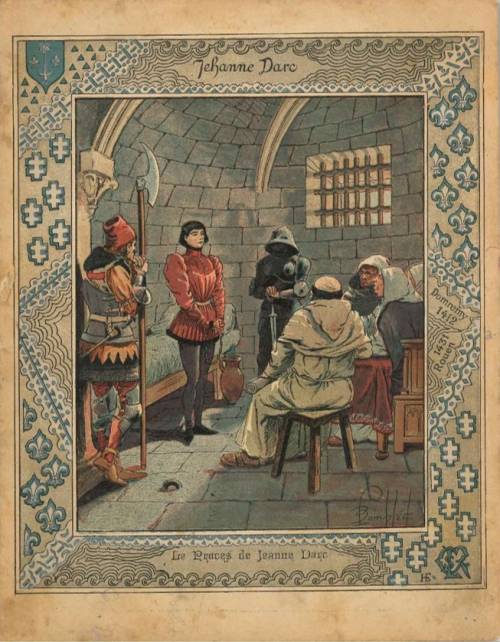 Couverture non numérotée : Procès de Jeanne Darc. Chromolithographie sur papier épais. Frise bleue avec blason et fleur de lys, avec deux dates : Domrémy 1412 / Rouen 1431. En pages intérieures, texte explicatif anonyme avec gravure. Au dos, cliché : statue de Jeanne d’Arc à Bonsecours.